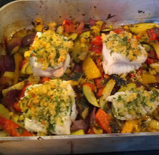 Imens smuldrer du brød til brødkrummer, vender det med revet parmasan, krydderurter, olivenolie, citronskal og salt og peber. Pres det sammen og fordel det på fiskestykkerne. Tag bradepanden med grøntsager ud og læg fiskestykkerne oven på. Sæt tilbage i ovnen og bag i 10-12 minutter ved 180 grader (bagetiden afhænger af fiskens størrelse).